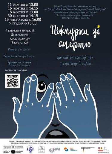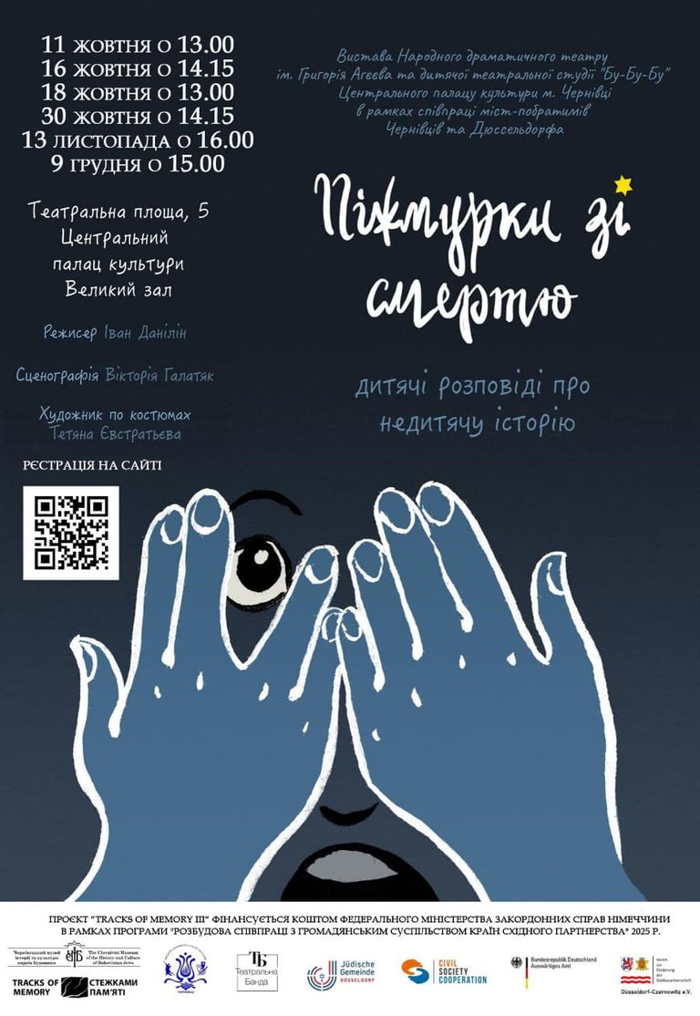 Вистава “Піжмурки зі смертю: дитячі розповіді про недитячу історію” підготовлена за мотивами однойменної книги Народним драматичним театром ім. Григорія Агєєва та дитячою театральною студією “Бу-Бу-Бу” в рамках співпраці міст-побратимів Чернівців та Дюссельдорфа.