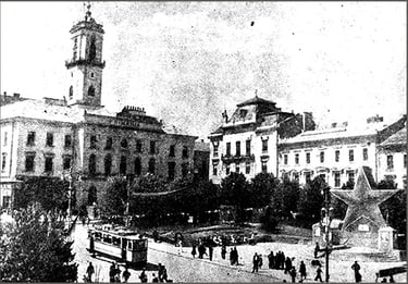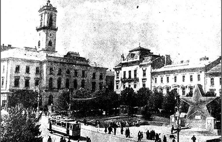 Чернівці, 1940 рік. Центральна площа з п’ятикутною радянською зіркою, встановленою на місці румунського пам’ятника “Унірії” (“Об’єднання”).