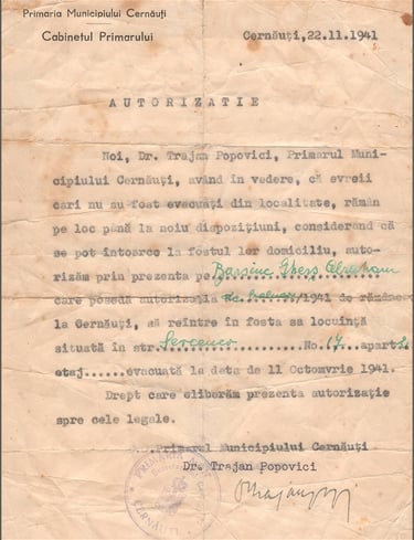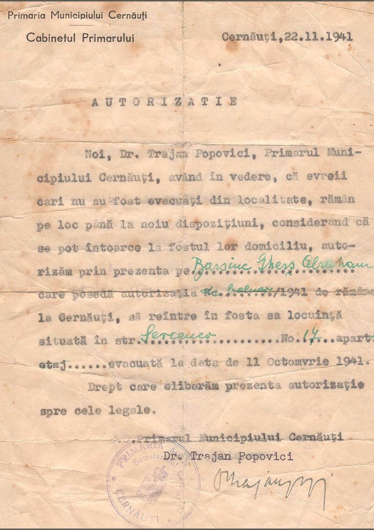 Авторизація для сім’ї Бурсуків, видана Траяном Поповичем 22 листопада 1941 року.