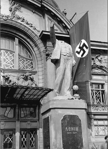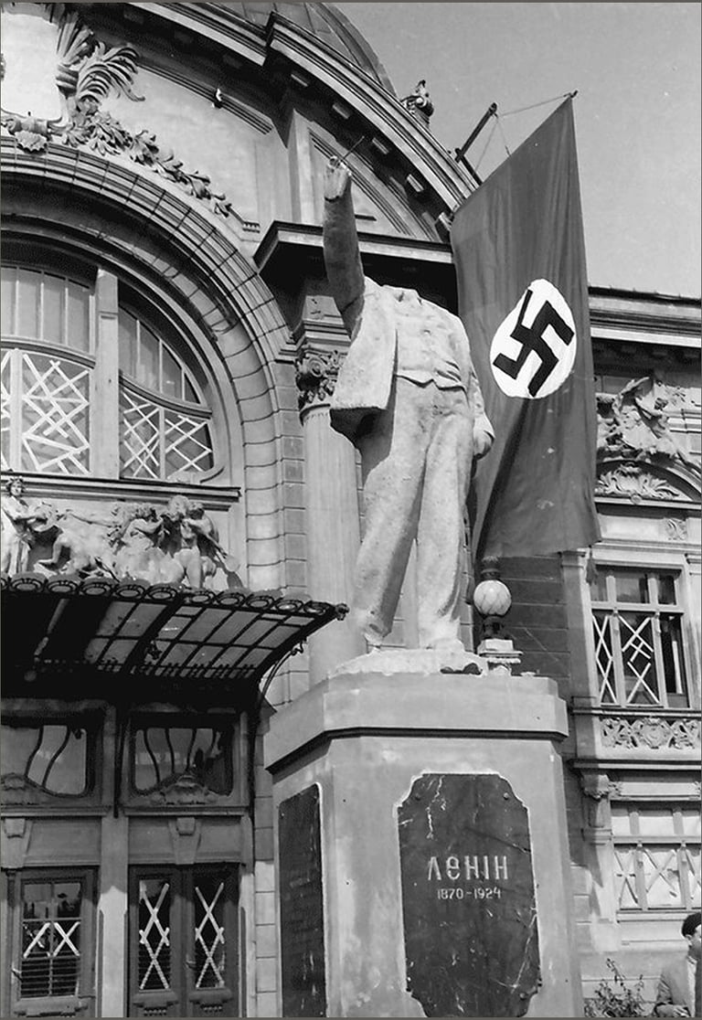 Чернівці, 1941 рік. Обезголовлений пам’ятник Леніну біля театру – символ чергової зміни влади.