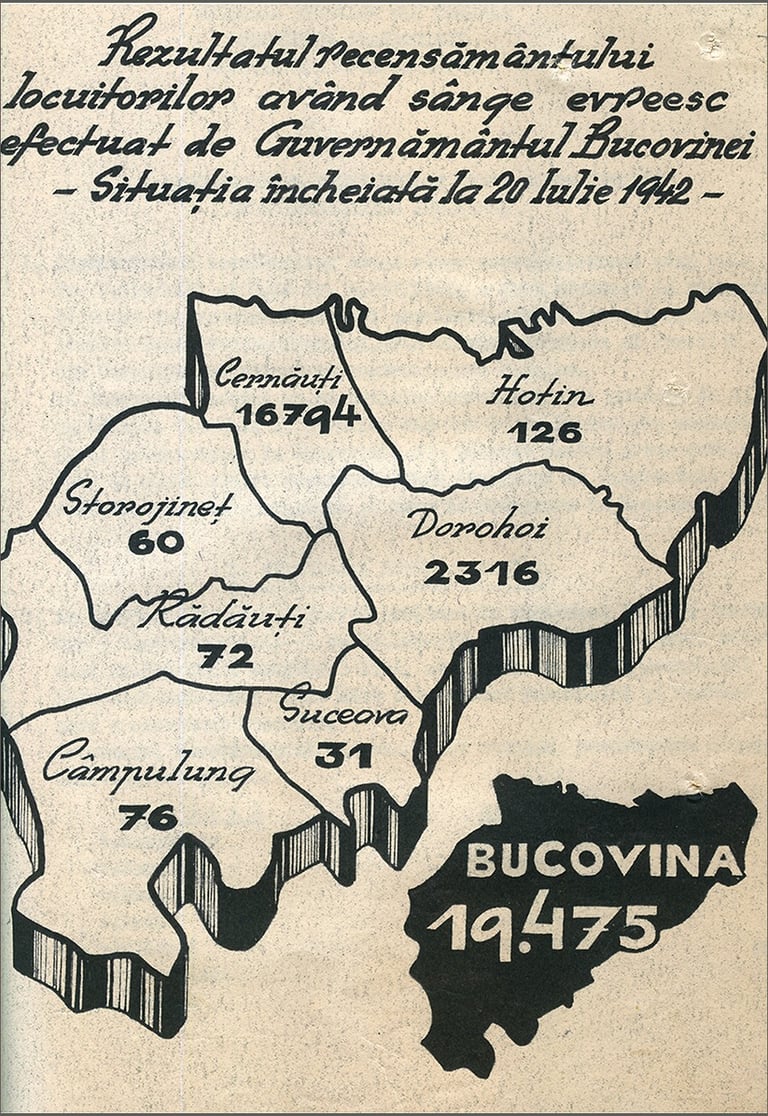 Фрагмент офіційного звіту румунської адміністрації у вигляді мапи про кількість євреїв, що залишилися на території Буковини та Північної Бессарабії станом на липень 1942 року.