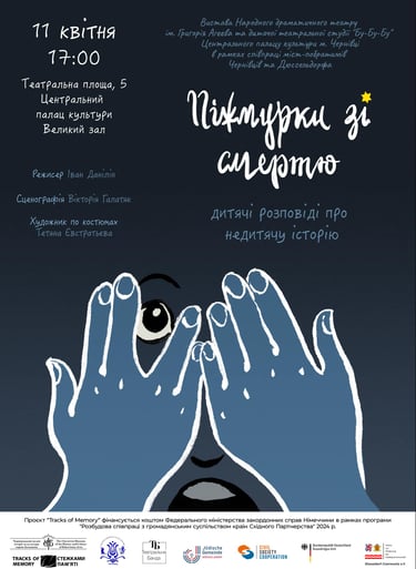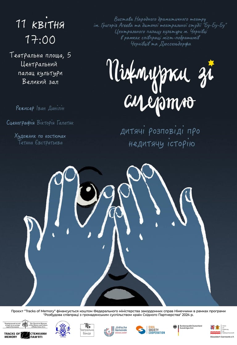 Вистава “Піжмурки зі смертю: дитячі розповіді про недитячу історію” підготовлена за мотивами однойменної книги Народним драматичним театром ім. Григорія Агєєва та дитячою театральною студією “Бу-Бу-Бу” в рамках співпраці міст-побратимів Чернівців та Дюссельдорфа.